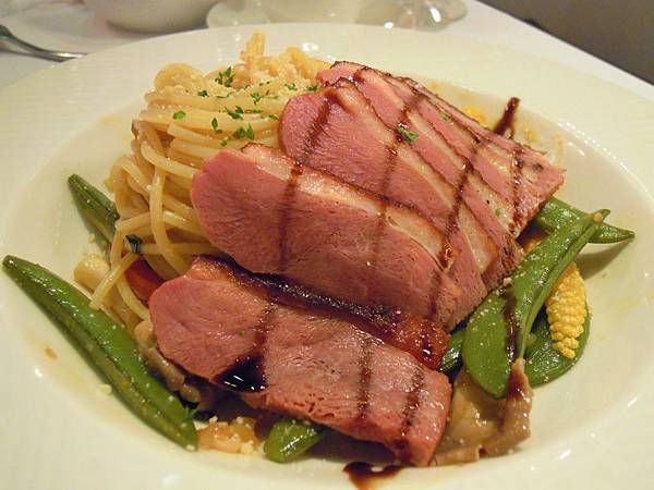 在這裡不得不提一下它的海鮮真的很新鮮,干貝一咬下飽滿多汁,帶有脆度的Q彈口感令人為之驚艷,奶油拌炒的義大利麵也將湯汁吸進去,吃起來特別香。鴨胸厚實鮮嫩,搭配蔬菜一起吃剛剛好,而另一道的培根雞肉也帶出煙燻的香氣,幾乎每一道都好吃!