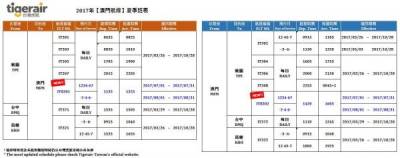 台灣虎航​澳門航線增班 限時優惠699元起 ▲台灣虎航澳門線2017年夏季班表。(圖/台灣虎航)