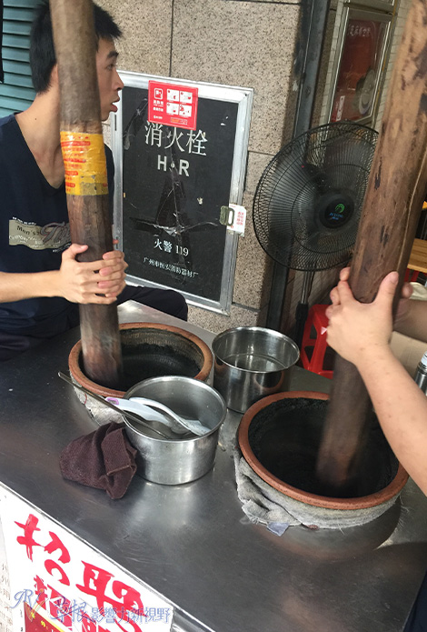 所謂手擂,顧名思義就是用手工製作的意思。在廣州西華路就有這麼一家堅持傳統,純手工捶打芝麻糊的店鋪——芝麻糊世家。芝麻糊世家很容易找,當你在西華路看到店門口有兩個壯漢在用一根又粗又長的木棒在捶打石臼里的芝麻時,你就找到了這家店。
