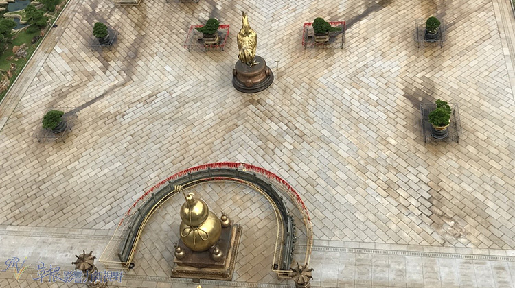 廣場的佈局有八棵景觀樹、正中央為金雞、後方為金絲葫蘆
