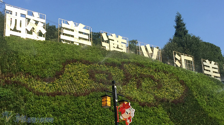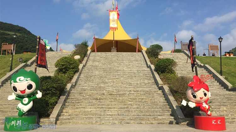景區入口擺置匯川區的吉祥物匯匯與川川,帳棚為服務中心